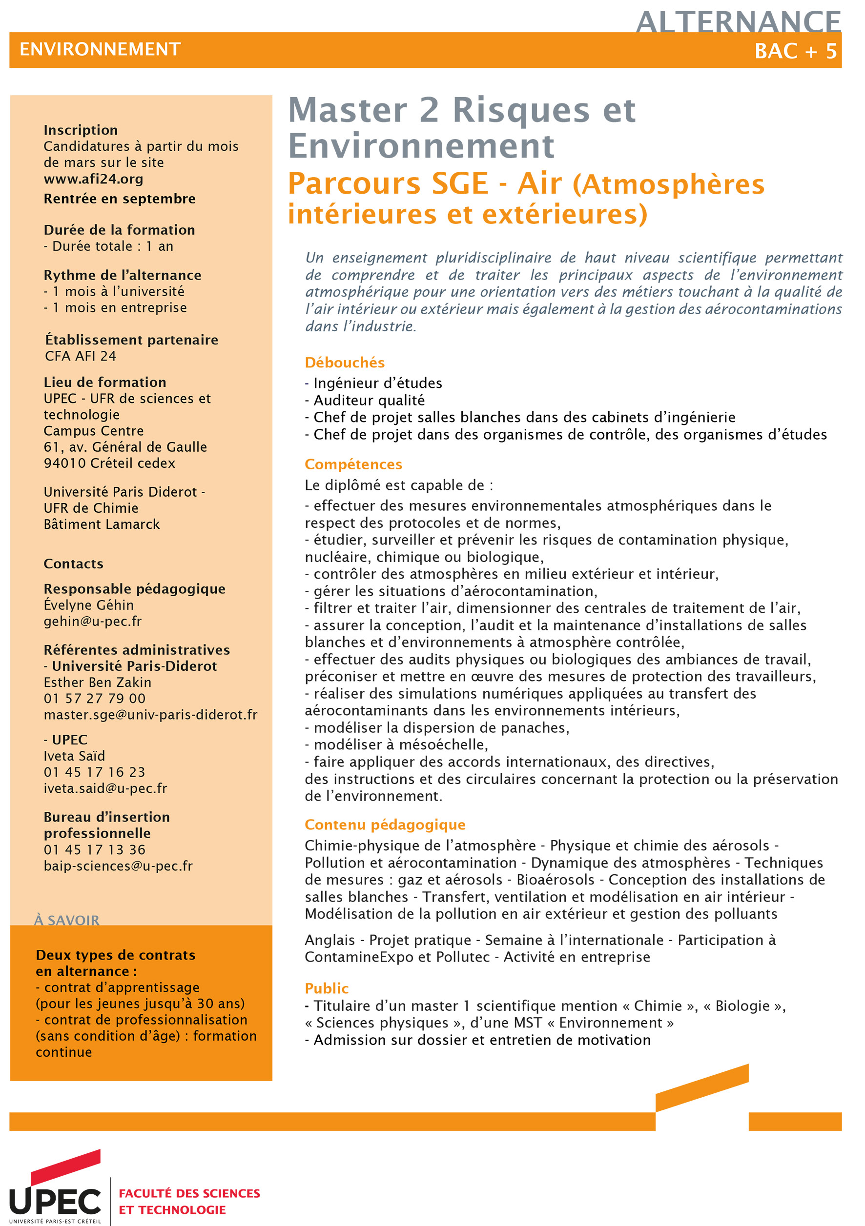 Master Risques et environnement parcours SGE - Atmosphères intérieures et extérieures (AIR)