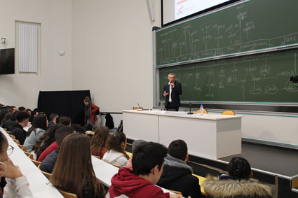 Dans un amphithéâtre occupé par près de 350 lycéens accompagnés de leurs enseignants, Jacques Moscovici, doyen de la faculté des sciences et technologie, et Christophe Morin, enseignant-chercheur à la faculté des sciences et technologie, président de Promosciences et responsable des cordées de la réussite "Banlieue-Est : cap vers les sciences" et "CordéE-Link, sciences connected", ont lancé cet événement avant l’ouverture de la phase d’inscription et de formulation des vœux sur Parcoursup. Dans une ambiance surchauffée par la participation de Froggy, la mascotte de l’association du Bureau des étudiants de sciences et technologie (STBDE), la matinée s’est poursuivie avec la conférence de Damien Jayat.